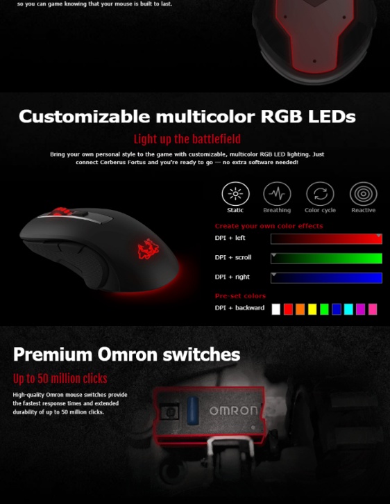 - Premium Omron switches provide crisp, tactile feedback and up to a 50-million-click lifespan