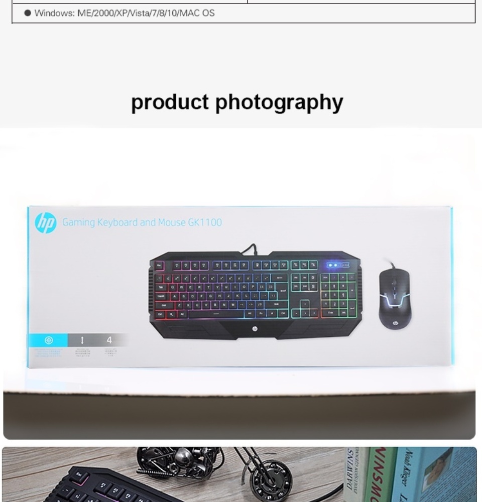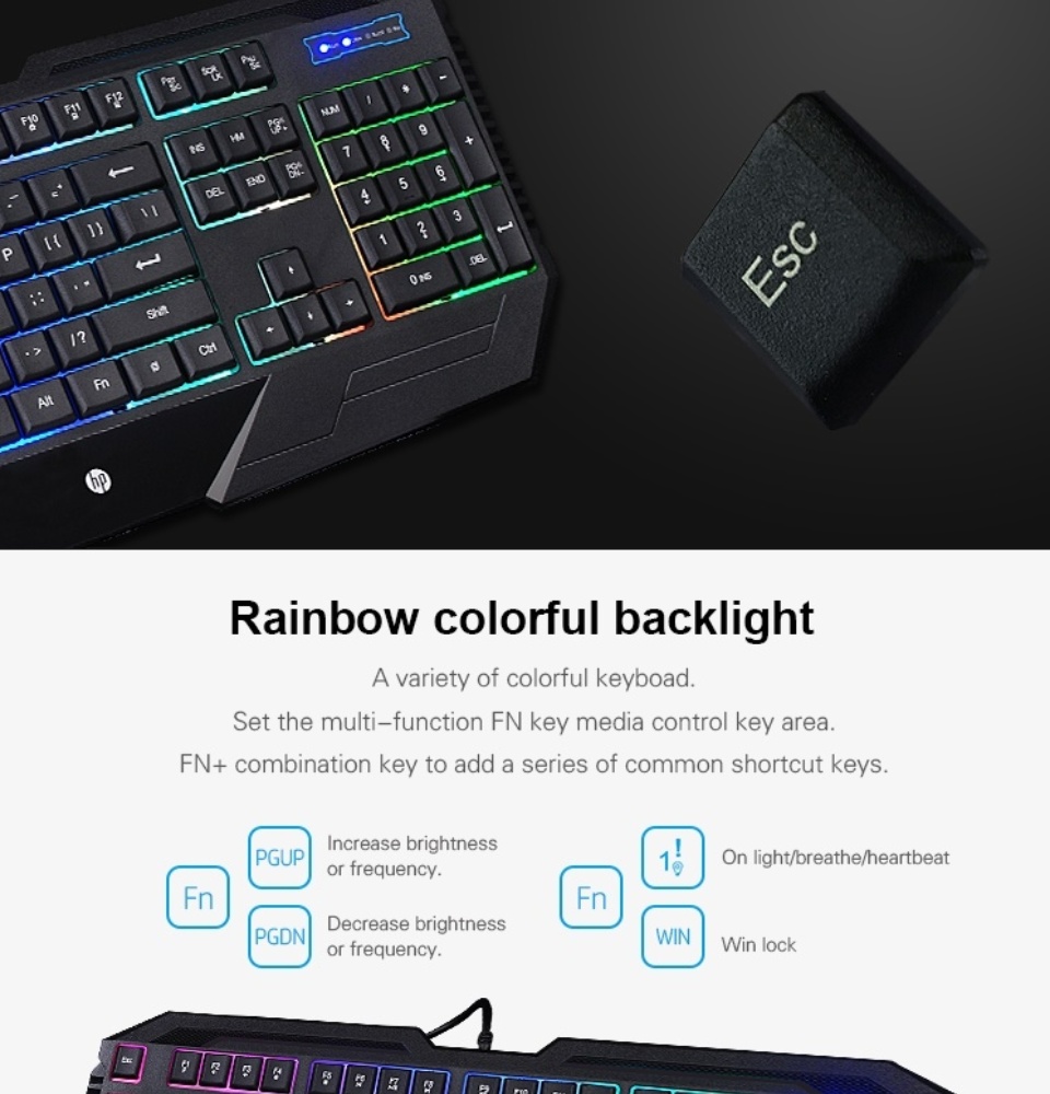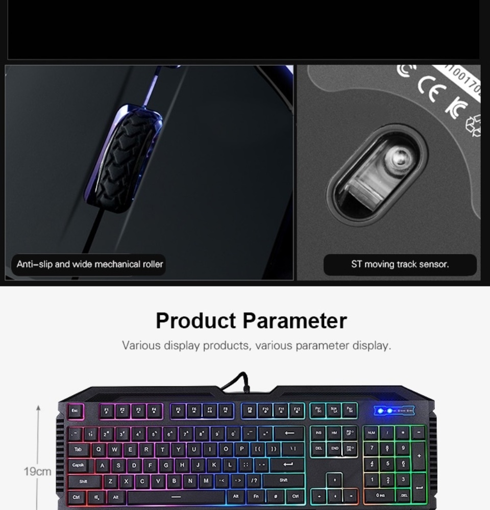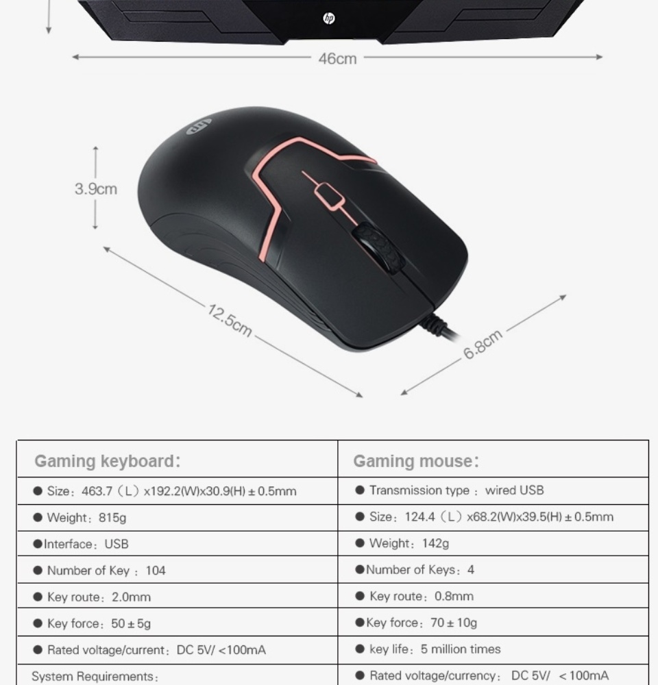 - Gaming Membrane KeyboardConnection TypeUSB WiredKey Route2.0mmKey Force50g ± 50gBacklightColorfulKey LifeUp to 10 million cyclesRated Voltage/currentDC 5V/ 100mASupported Operating SystemWindows 7 / 8.1 / 10 and Mac OS: 10.3Unpackaged Product Dimensions463.7mm(L) x 192.2mm(W) x 30.9mm (H)Cable Length1.8M (rubber cable)Unpackaged Product Weight815±5g (includes cable)Gaming MouseConnection TypeUSB WiredTracking MethodInfrared OpticalDPI (Min/Max)1000-1600SensorSunplus 168ANumber of Buttons4Button press distance0.7mmButton press force70g ± 10gButton press lifeUp to 5 million clicksRated Voltage/currentDC 5V/ 100 MaSupported Operating SystemWindows 7/8.1 / 10 and Mac OS: 10.3Unpackaged Product Dimensions124.2 x 68.2 x 39.5 mm (LxWxH)Cable Length1.5M (rubber cable)